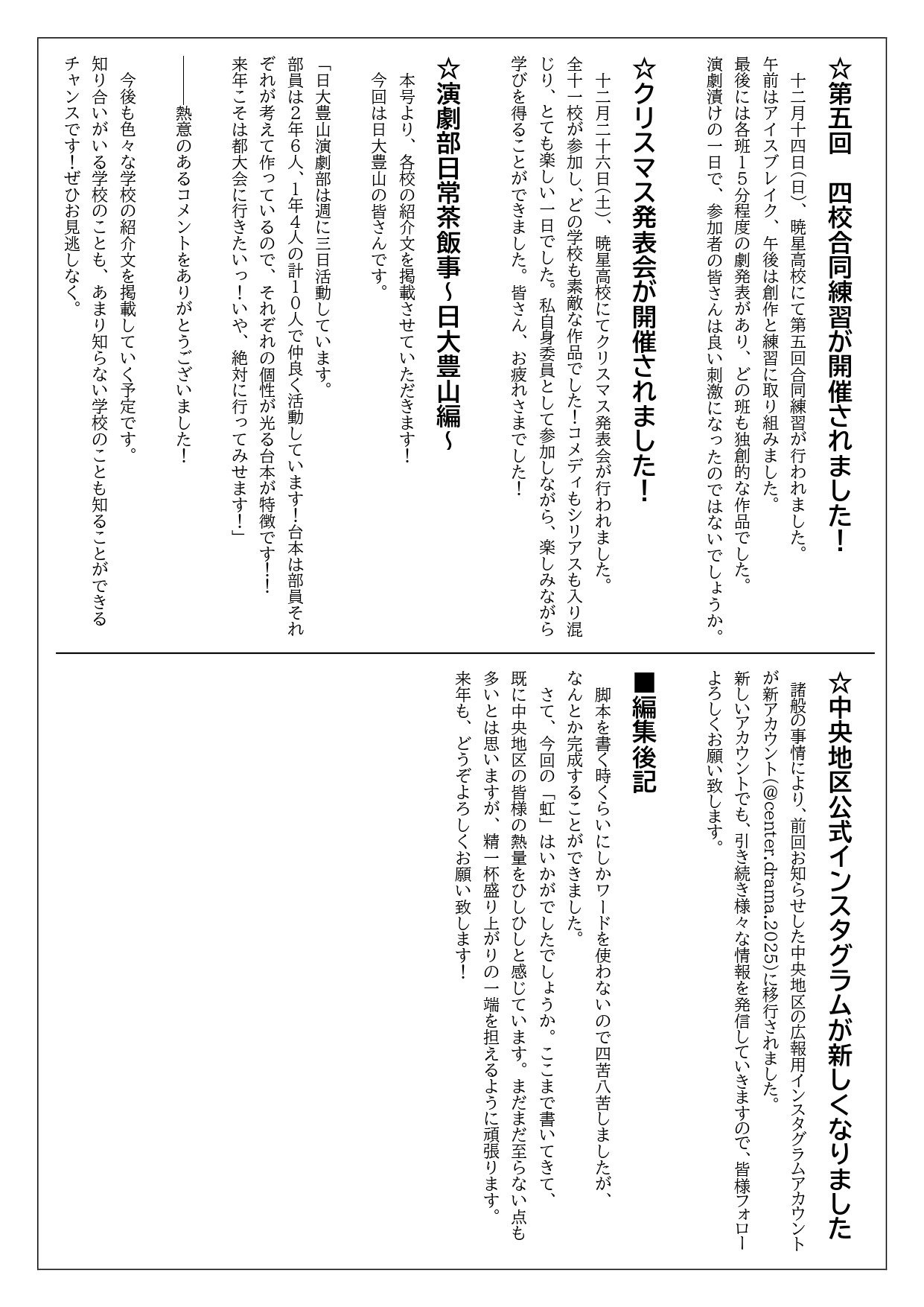 開場:1100 出演者への連絡 当日は朝から音響チェック をします。 中央卒公 800から 900 山城卒公 900から 940 中央合同 940から 1020 山城合同 1020から 1100 中央は50周年記念館 山城は教室 ■2/17(日)冬季発表会 会場:都立晴海総合高校 暁星 11:10〜11:30『 CHOCOLATE MONEY 』 戸山 11:35〜11:55『銀河鉄道の夜のような夜』 新宿山吹 12:05〜12:25『甘じょっぱいのぱい』 竹早 12:40〜13:05『TAKE GEKI』 立教池袋 13:10〜13:35 『討論番組で爆発的な人気を得る方法』 駒込 13:40〜14:10『宇宙人さん』 日大豊山 14:15〜14:35『二人のエリート』 新宿 14:50〜15:10『却下』 九段中等 15:15〜15:35『いの中の・・・?』 城西 15:40〜16:05 『あの頃はパッションフルーツ』 晴海総合 16:10〜16:35『スリーアール大山』』 ■12/23 クリスマス発表会、終了! (^_^)